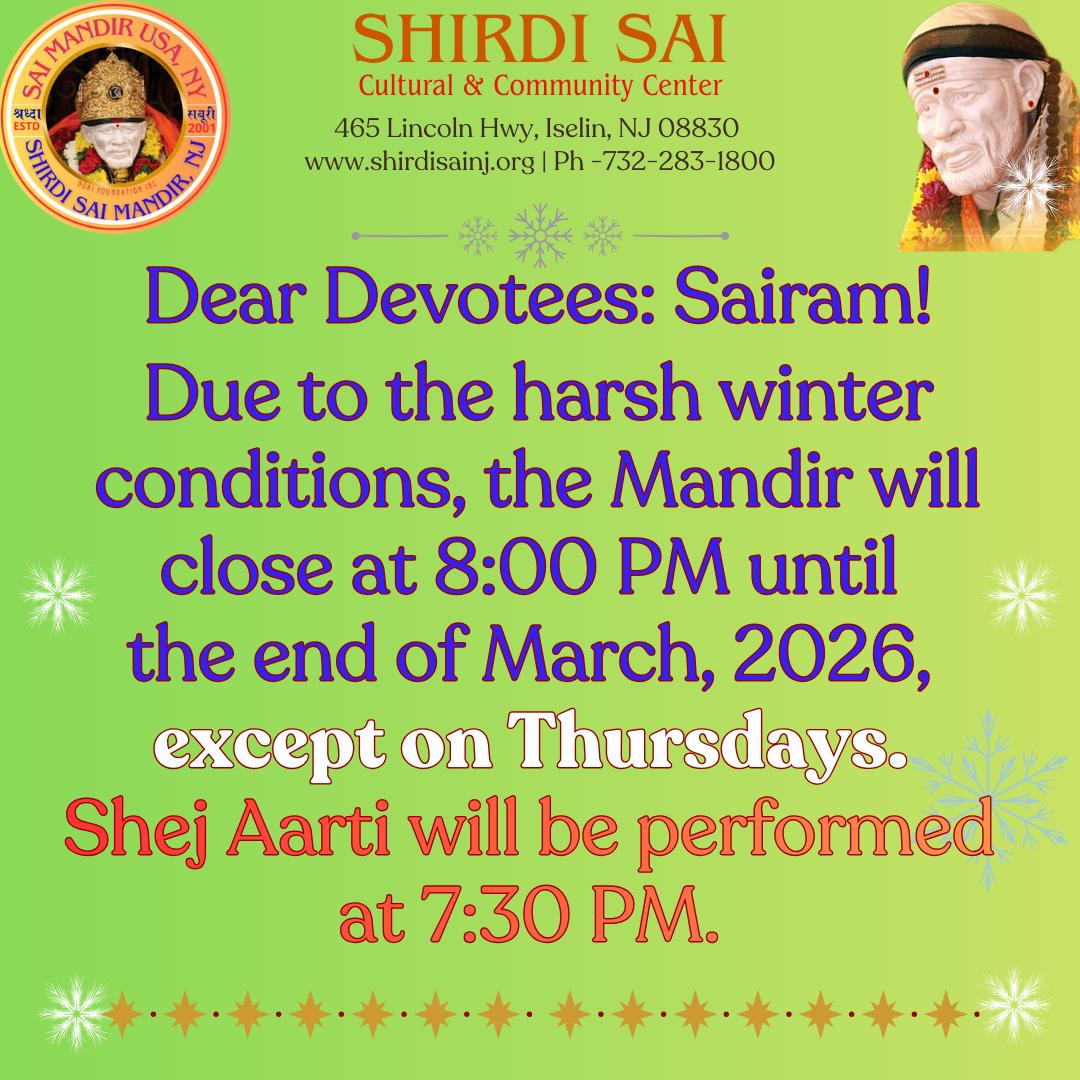 Sai Mandir, Iselin NJ has been visited by thousands of Sai devotees around the USA. This mandir has been regarded as Shirdi of America due to the very fact that all the rituals like Aartis, Bhajans, Services are conducted identical to those in Shirdi Sai Baba temple, India. The phenomena growth of devotee base on fast pace suggests us that this Mandir is showing the signs of becoming pilgrimage place in America soon. We appeal to all devotees across America to visit this Baba Mandir and take Sri Sai Baba's blessings at this sanctified holy place.